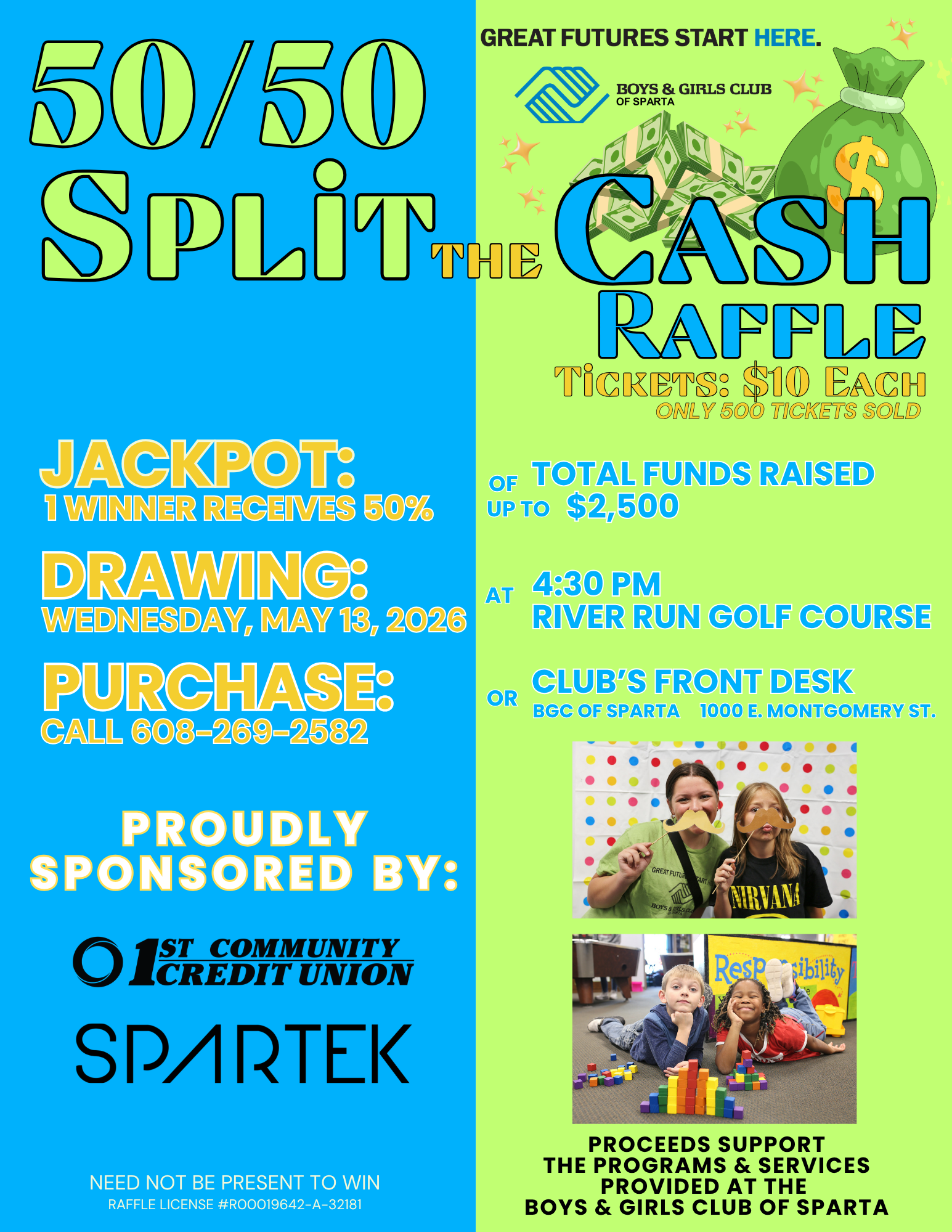 Your donation to the Boys & Girls Club of Sparta's 50/50 Split the Cash Raffle ensures that Sparta's youth will continue to receive excellent programming, mentoring, and academic assistance at our Club!