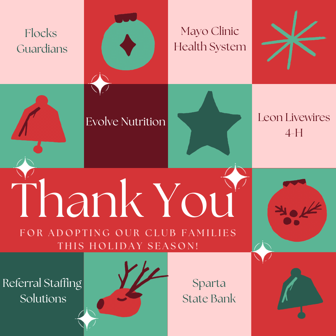 To adopt a family for Holiday gifts, please complete the form by November 22nd. You will be contacted and matched with a family, and information on needed items will be shared with you. Please drop gifts off by December 13th. Gifts do not need to be wrapped. If you prefer to have Club staff shop for you, please send in your monetary donation when you fill out the request form.